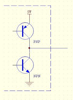 Apabila output dari port tersebut HIGH, maka transistor sebelah atas (PNP) akan ON, mengalirkan arus dari Vcc ke beban, sedangkan apabila outputnya LOW, maka transistor sebelah bawah (NPN) akan ON dan menarik arus dari beban ke GROUND.